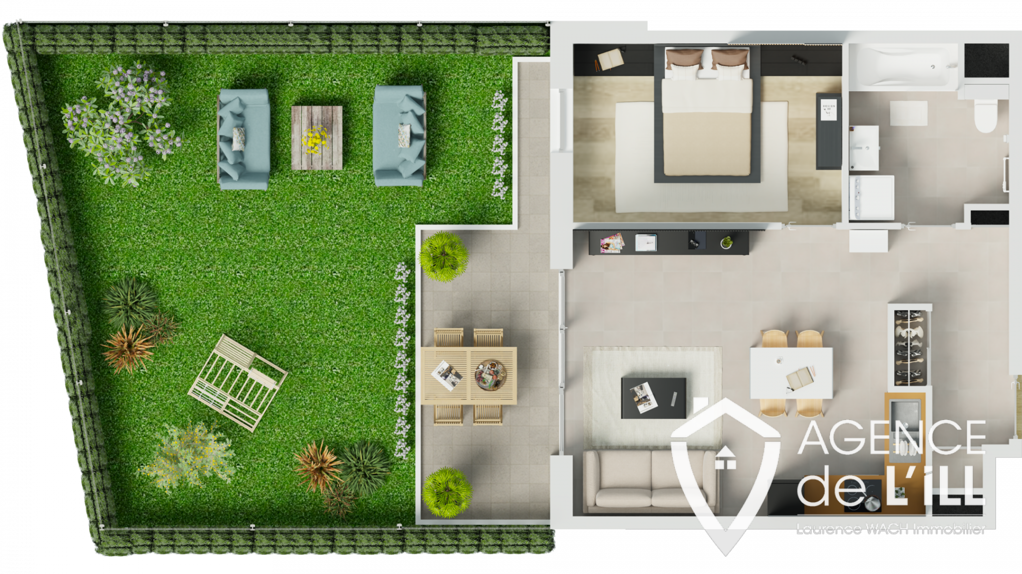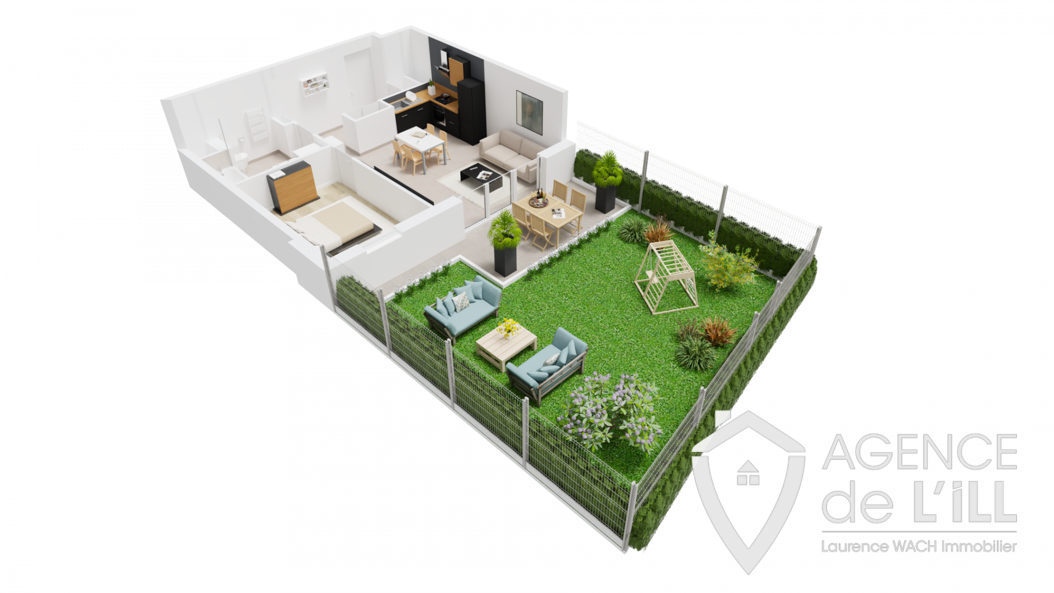 Superbe appartement F2 en rez de jardin privatif de 47.25m2, accès PMR qui se compose comme suit : une belle entrée, une chambres avec accès PMR, une salle de bains avec toilette, l'espace de vie de 23.12m2 ouvert sur la cuisine et accès à la terrasse de 9m2 et au jardin privatif de 49m2.